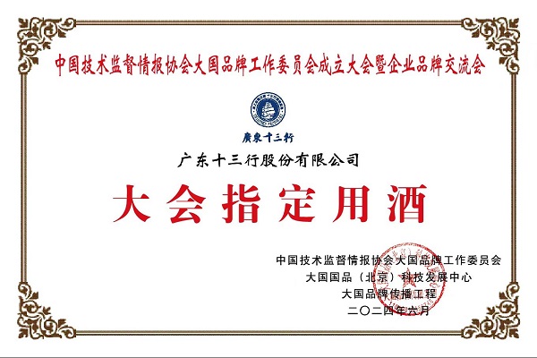 品牌与高质量发展永远是企业的灵魂,是市场拥有的核心武器,2024年6月16日,中国技术监督情报协会大国品牌工作委员会在北京成立,十三行国际酱酒被优选为“大会指定用酒”。